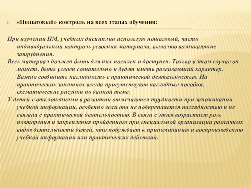 пошаговый, часто индивидуальный контроль усвоения материала, выявляю возникающие затруднения.