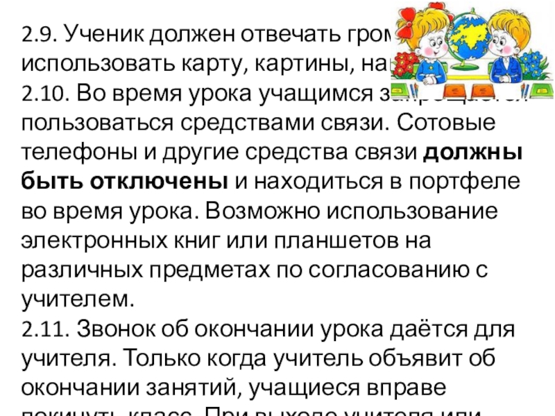 2.11. Звонок об окончании урока даётся для учителя. Только когда учитель объявит об окончании занятий, учащиеся вправе покинуть класс. При выходе учителя или другого взрослого из класса учащиеся встают.