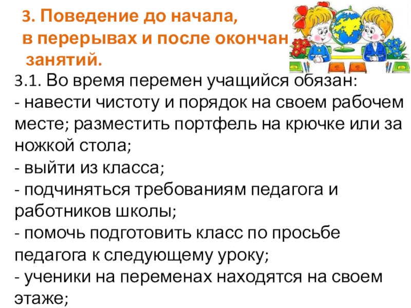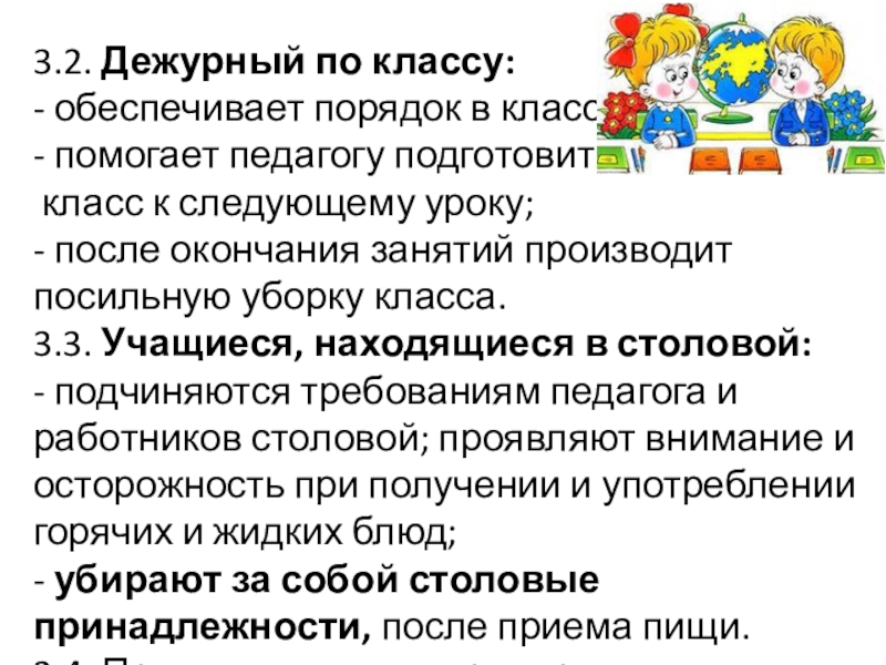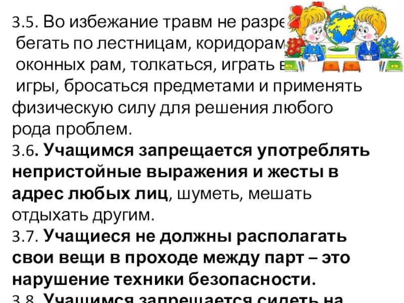 3.7. Учащиеся не должны располагать свои вещи в проходе между парт – это нарушение техники безопасности.