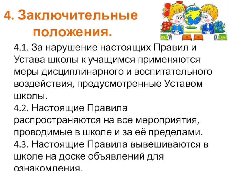 4.3. Настоящие Правила вывешиваются в школе на доске объявлений для ознакомления.