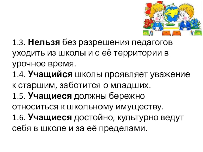 Слайд 41.3. Нельзя без разрешения педагогов уходить из школы и с её