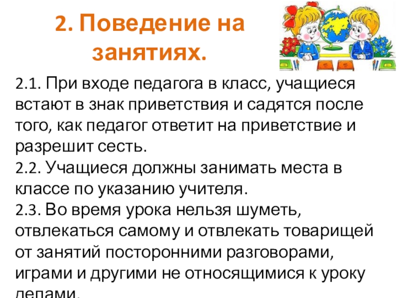 2.2. Учащиеся должны занимать места в классе по указанию учителя.