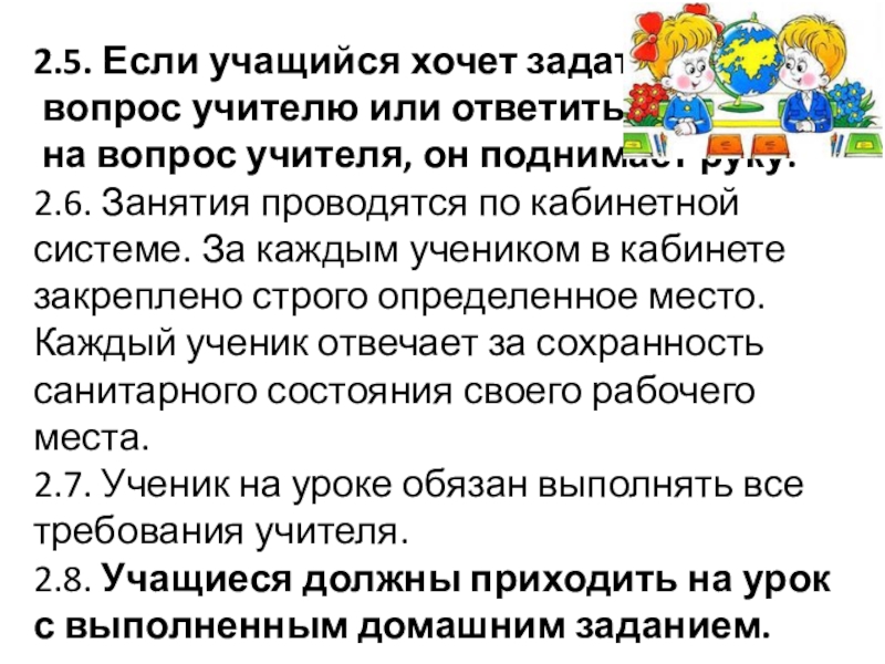 2.6. Занятия проводятся по кабинетной системе. За каждым учеником в кабинете закреплено строго определенное место. Каждый ученик отвечает за сохранность санитарного состояния своего рабочего места.