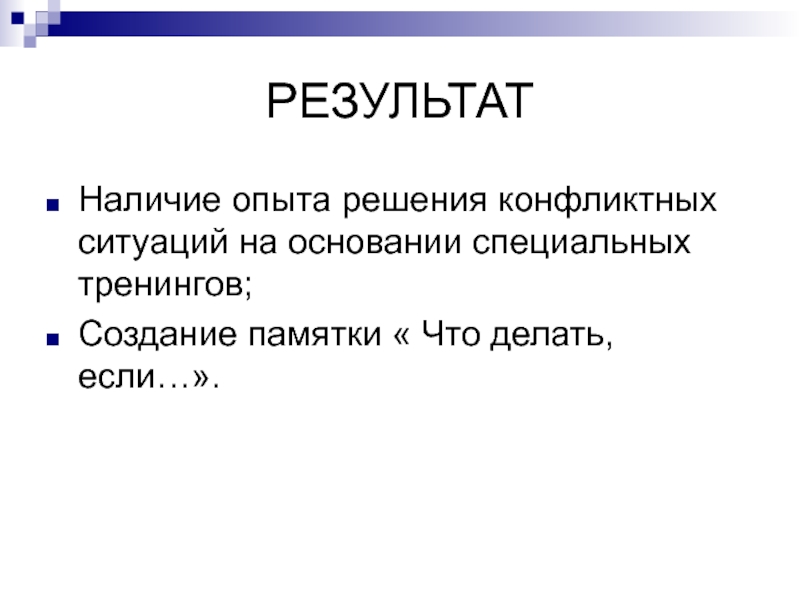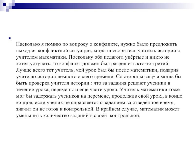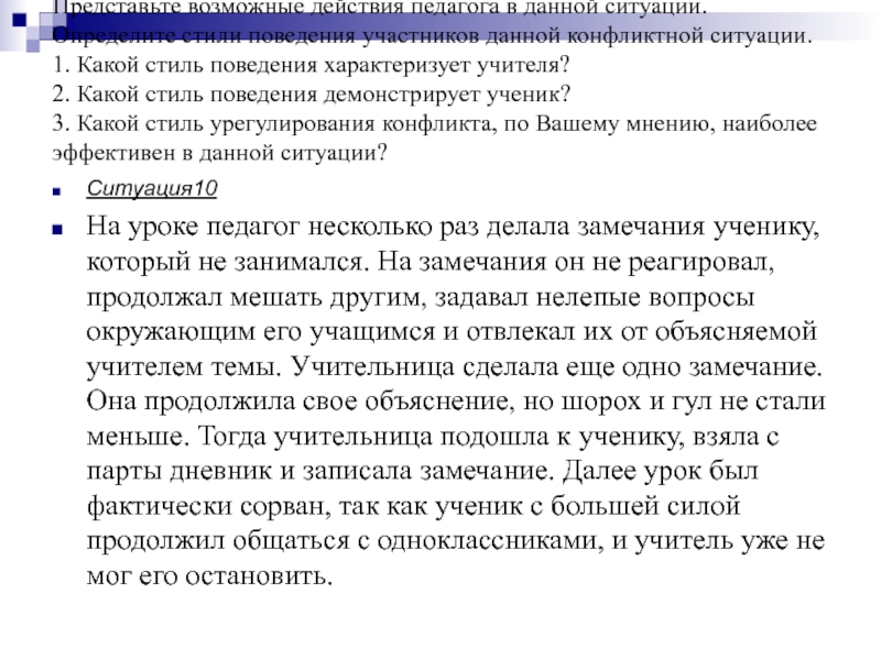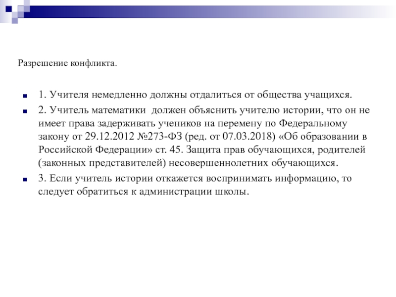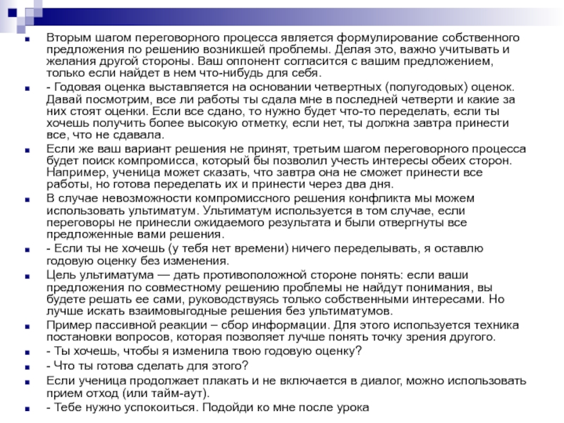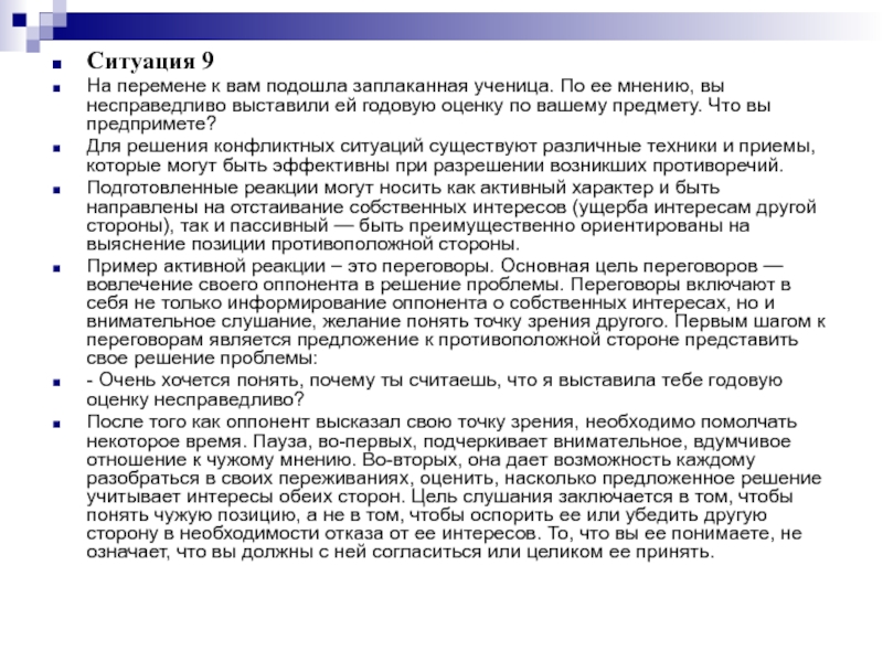 3. Стиль урегулирования конфликта- сотрудничество. Необходимо проявить эмоциональную выдержку. Учитель должен сдерживать свои эмоции, тем более не переводить конфликт на личностный уровень, не затрагивать чувство собственного достоинства ученика.
