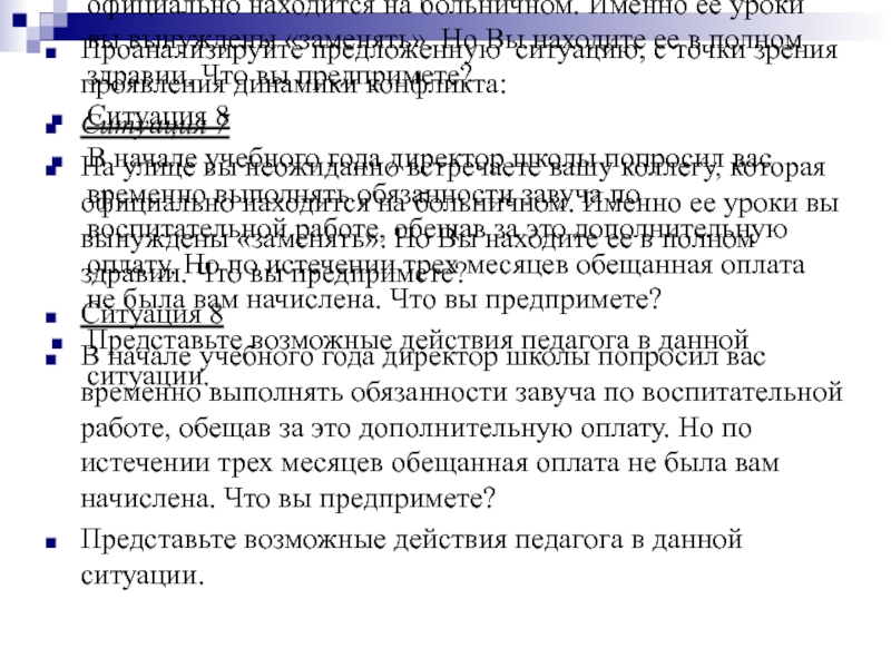 На улице вы неожиданно встречаете вашу коллегу, которая официально находится на больничном. Именно ее уроки вы вынуждены «заменять». Но Вы находите ее в полном здравии. Что вы предпримете?