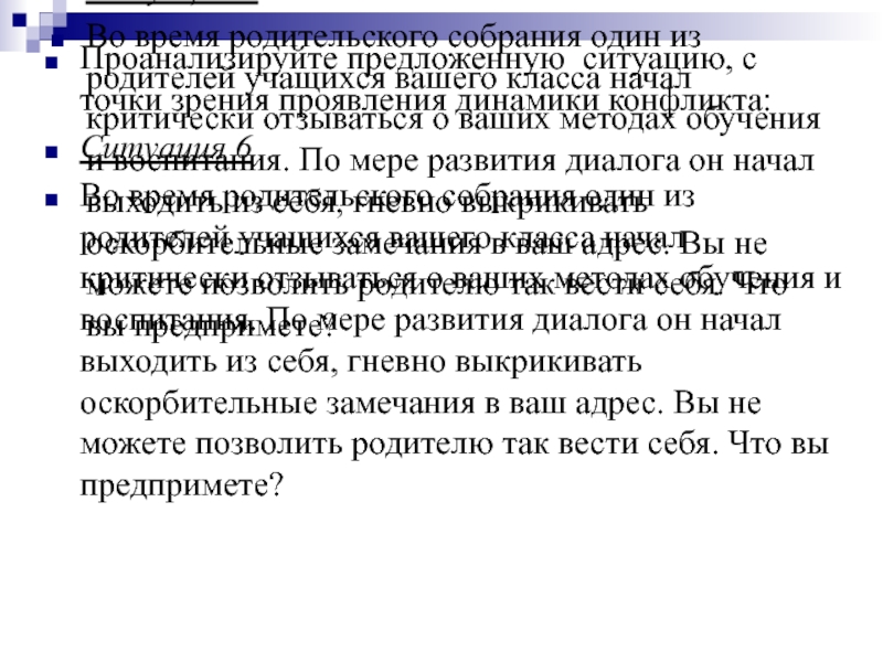 Во время родительского собрания один из родителей учащихся вашего класса начал критически отзываться о ваших методах обучения и воспитания. По мере развития диалога он начал выходить из себя, гневно выкрикивать оскорбительные замечания в ваш адрес. Вы не можете позволить родителю так вести себя. Что вы предпримете?
