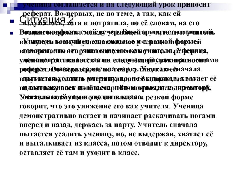 Возник конфликт между ученицей и учителем: учитель возмущен плохой успеваемостью ученицы и дает ей возможность исправить оценки с помощью реферата, ученица соглашается и на следующий урок приносит реферат. Во-первых, не по теме, а так, как ей вздумалось, хотя и потратила, по её словам, на его подготовку весь свой вечер. Во-вторых, весь помятый. Учитель возмущен еще сильнее и в резкой форме говорит, что это унижение его как учителя. Ученица демонстративно встает и начинает раскачивать ногами вперед и назад, держась за парту. Учитель сначала пытается усадить ученицу, но, не выдержав, хватает её и выталкивает из класса, потом отводит к директору, оставляет её там и уходит в класс.