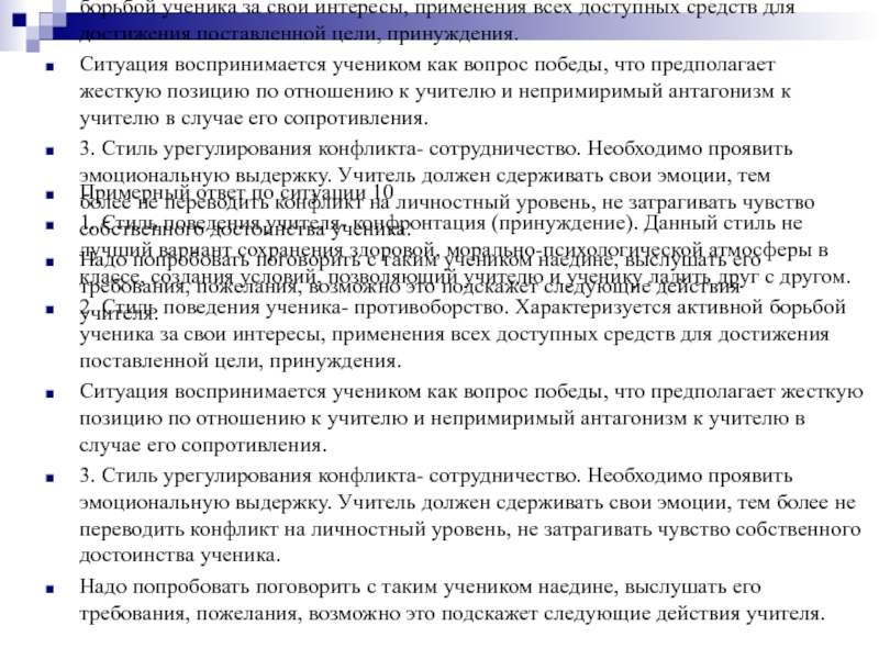 2. Стиль поведения ученика- противоборство. Характеризуется активной борьбой ученика за свои интересы, применения всех доступных средств для достижения поставленной цели, принуждения.
