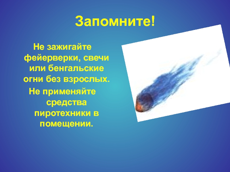 Запомните!Не зажигайте фейерверки, свечи или бенгальские огни без взрослых.Не применяйте средства пиротехники в помещении.