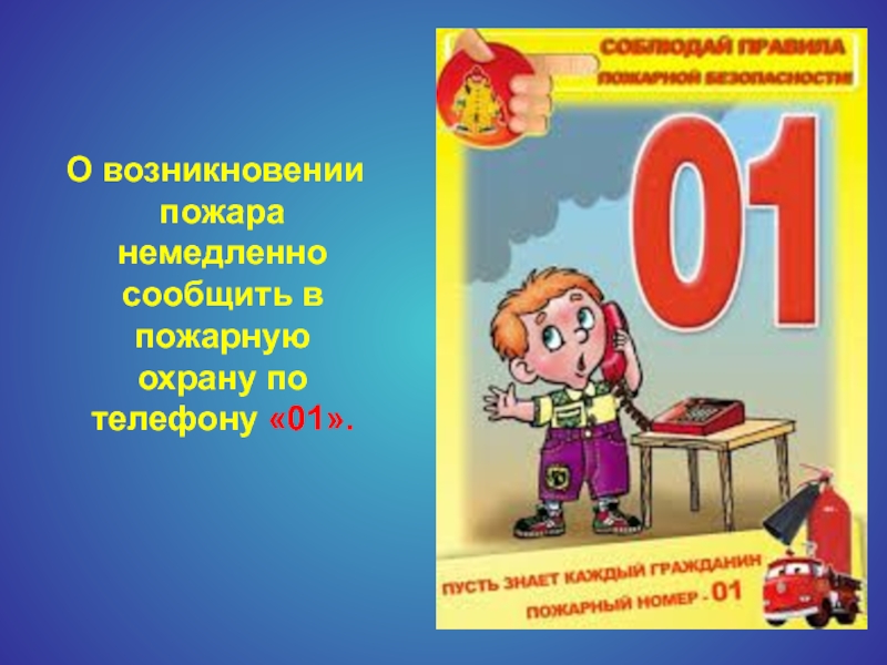 Слайд 10 О возникновении пожара немедленно сообщить в пожарную охрану по