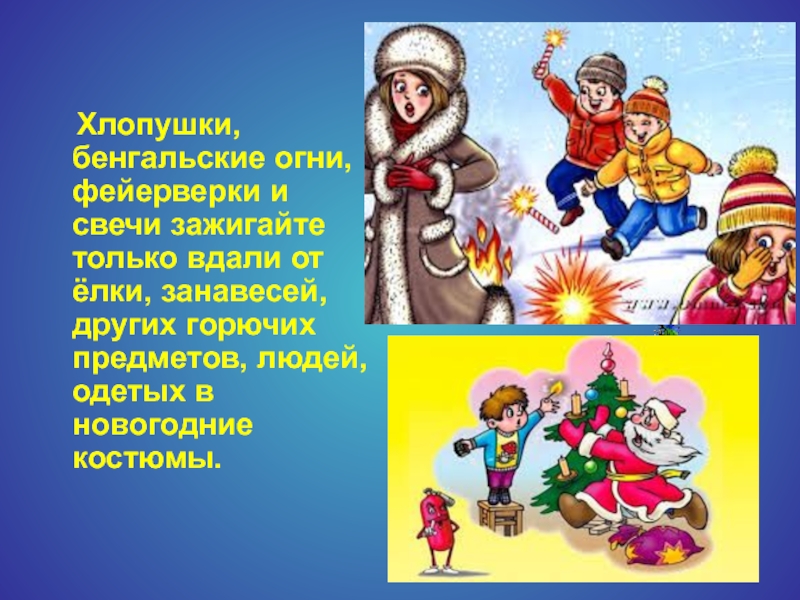 Хлопушки, бенгальские огни, фейерверки и свечи зажигайте только вдали от ёлки, занавесей, других горючих предметов,