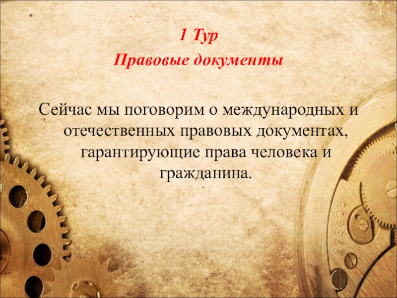 1 Тур Правовые документыСейчас мы поговорим о международных и отечественных правовых документах, гарантирующие права человека и гражданина.