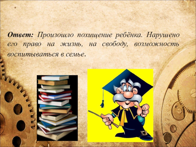 Слайд 16Ответ: Произошло похищение ребёнка. Нарушено его право на жизнь, на свободу,