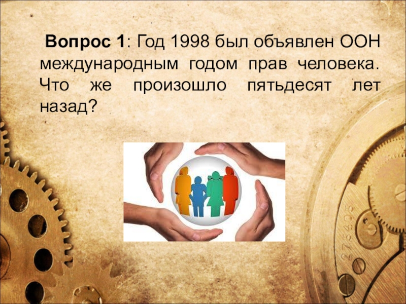 Вопрос 1: Год 1998 был объявлен ООН международным годом прав человека. Что же произошло пятьдесят лет назад?