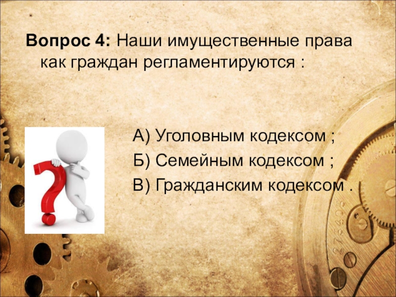 Слайд 10Вопрос 4: Наши имущественные права как граждан регламентируются :