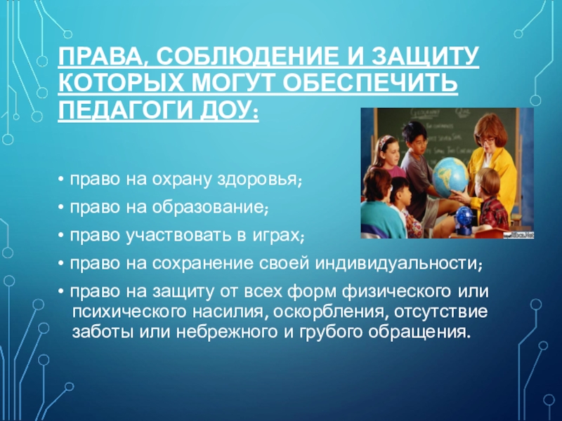 Слайд 6ПРАВА, СОБЛЮДЕНИЕ И ЗАЩИТУ КОТОРЫХ МОГУТ ОБЕСПЕЧИТЬ ПЕДАГОГИ ДОУ: