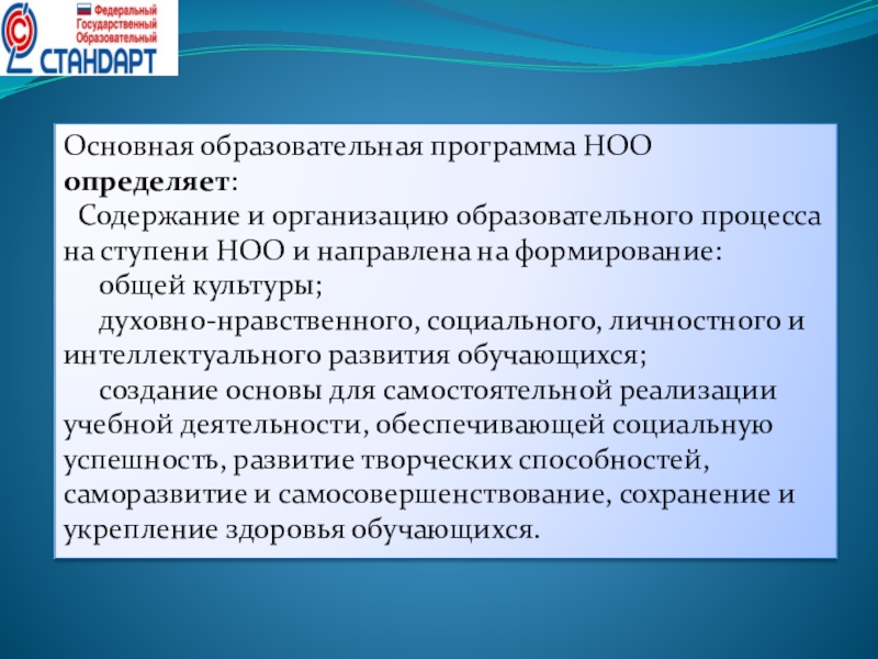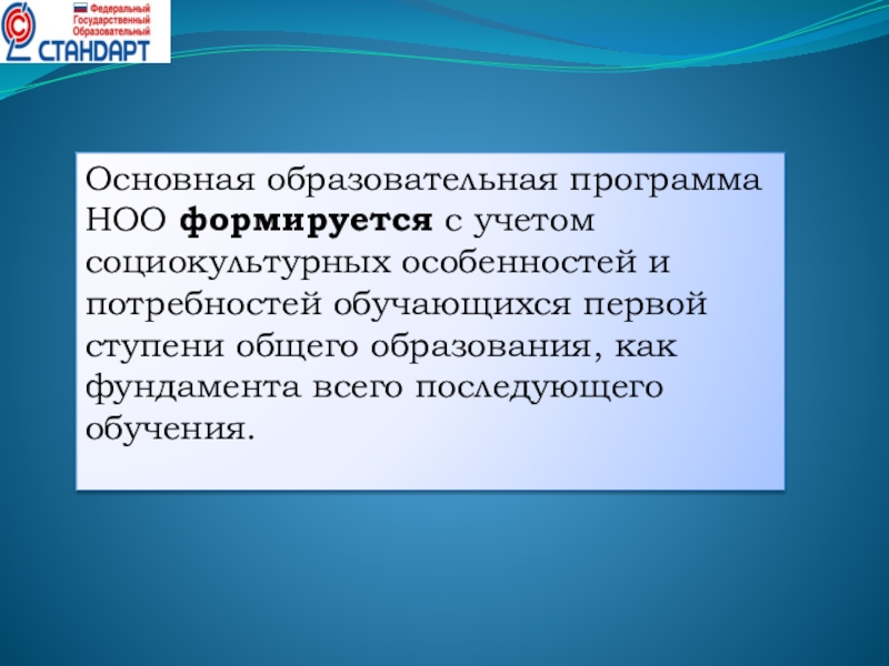 Слайд 15Основная образовательная программа НОО формируется с учетом социокультурных особенностей и потребностей