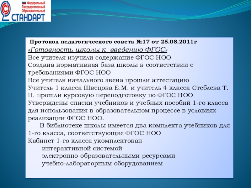 Слайд 20 Протокол педагогического совета №17 от 25.08.2011г «Готовность школы к введению
