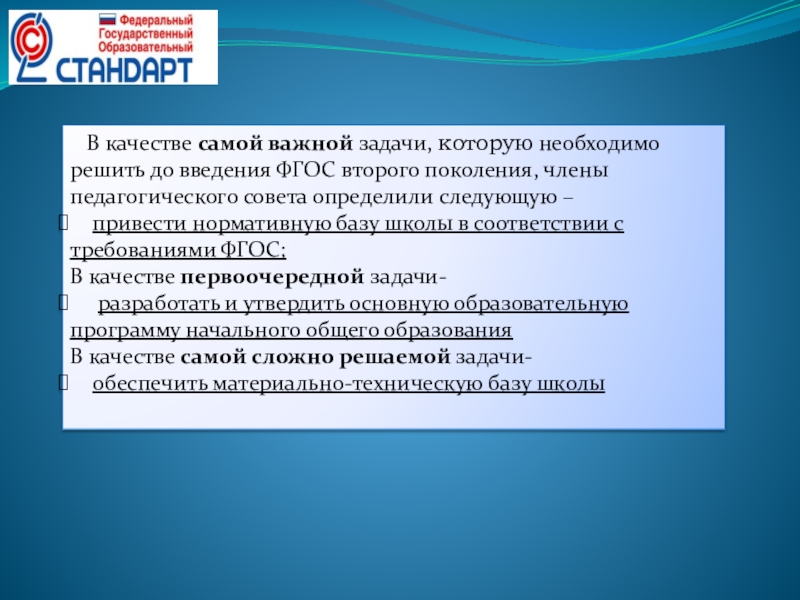 введения ФГОС второго поколения, члены педагогического совета определили следующую –