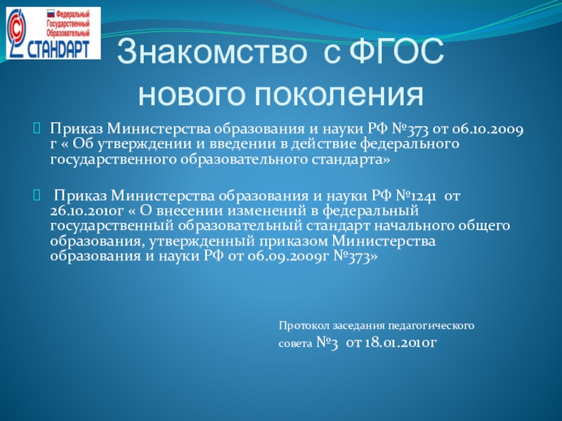 Приказ Министерства образования и науки РФ №1241 от 26.10.2010г « О внесении изменений в федеральный государственный образовательный стандарт начального общего образования, утвержденный приказом Министерства образования и науки РФ от 06.09.2009г №373»
