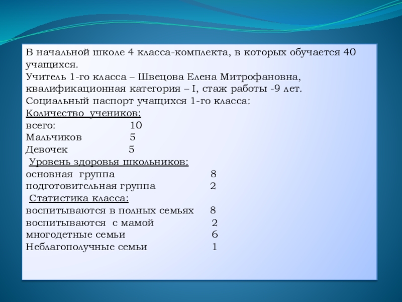 класса – Швецова Елена Митрофановна, квалификационная категория – I, стаж работы -9 лет.