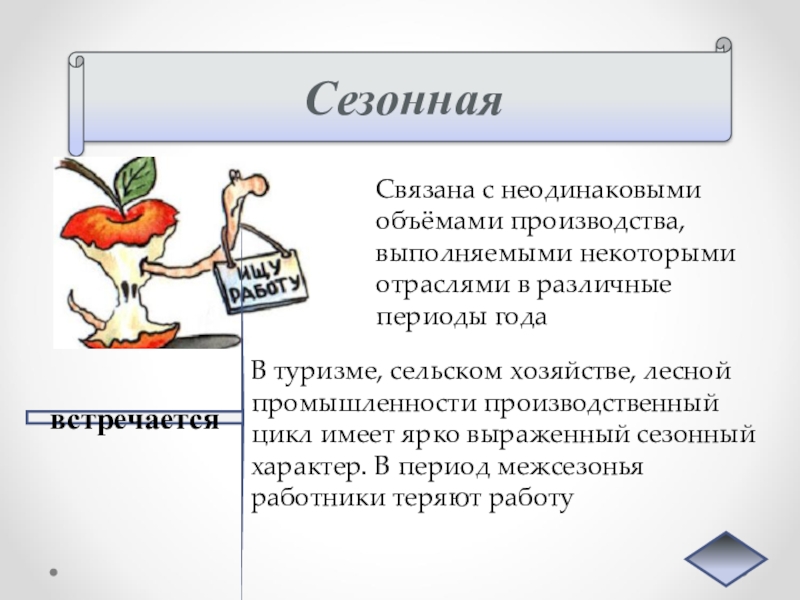 В туризме, сельском хозяйстве, лесной промышленности производственный цикл имеет ярко выраженный сезонный характер. В период межсезонья работники теряют работу