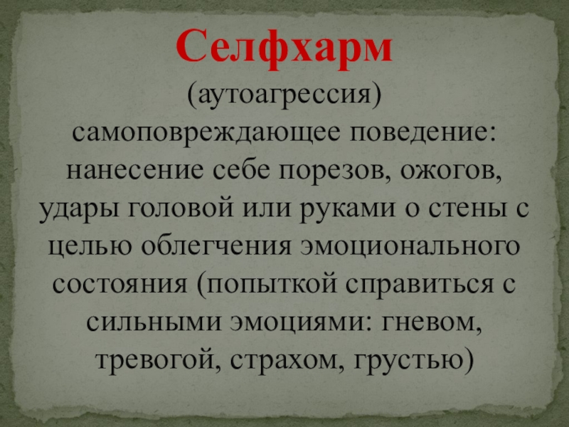 выход агрессии, злости, раздражения, которые, часто из-за страха или неумения управлять такими эмоциями, направляются внутрь, а не наружу