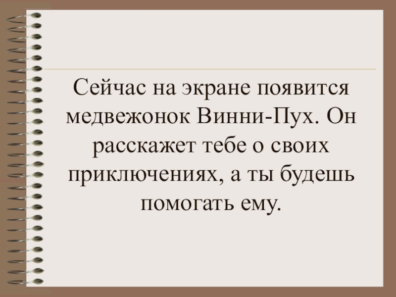 Слайд 2Сейчас на экране появится медвежонок Винни-Пух. Он расскажет тебе о своих