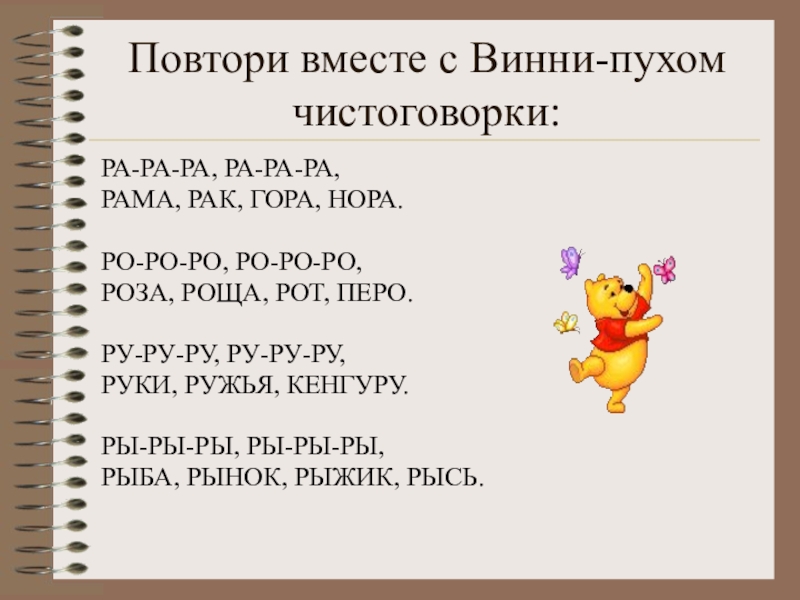 Повтори вместе с Винни-пухом чистоговорки:РА-РА-РА, РА-РА-РА,РАМА, РАК, ГОРА, НОРА.РО-РО-РО, РО-РО-РО,РОЗА, РОЩА, РОТ, ПЕРО.РУ-РУ-РУ, РУ-РУ-РУ,РУКИ, РУЖЬЯ, КЕНГУРУ.РЫ-РЫ-РЫ, РЫ-РЫ-РЫ,РЫБА,