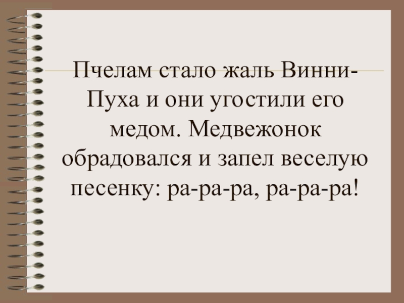 Пчелам стало жаль Винни-Пуха и они угостили его медом. Медвежонок обрадовался и запел веселую песенку: ра-ра-ра, ра-ра-ра!