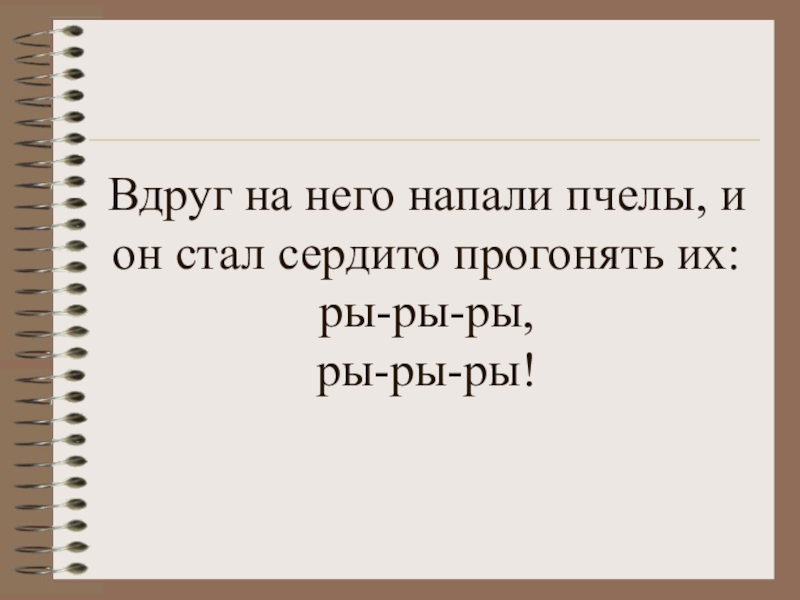 Вдруг на него напали пчелы, и он стал сердито прогонять их: ры-ры-ры,  ры-ры-ры!
