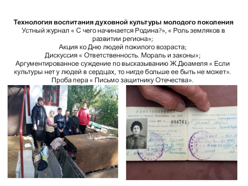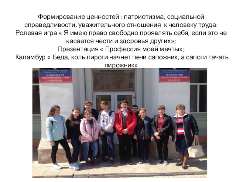 Формирование ценностей : патриотизма, социальной справедливости, уважительного отношения к человеку труда: