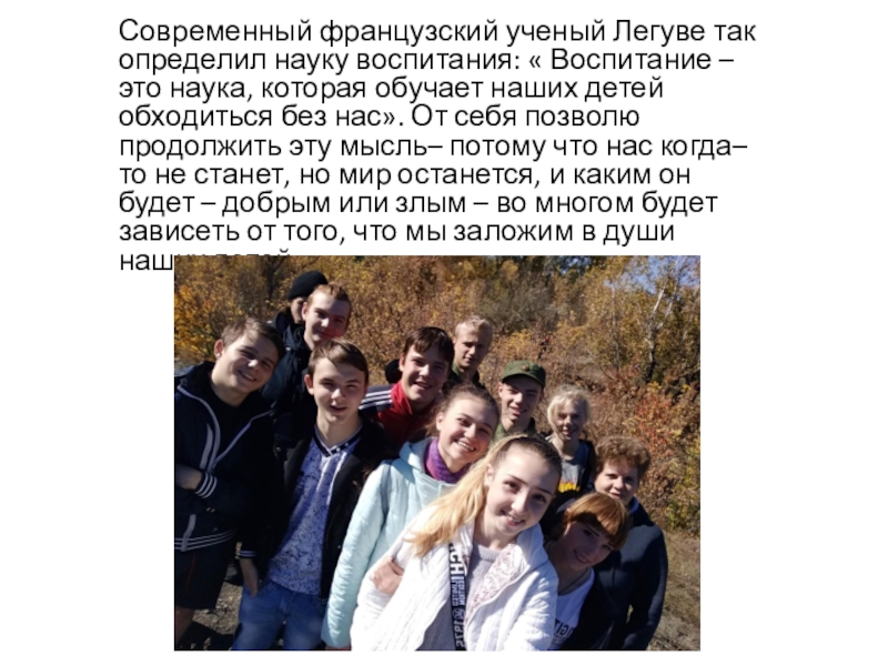 « Воспитание – это наука, которая обучает наших детей обходиться без нас». От себя позволю продолжить эту мысль– потому что нас когда– то не станет, но мир останется, и каким он будет – добрым или злым – во многом будет зависеть от того, что мы заложим в души наших детей.
