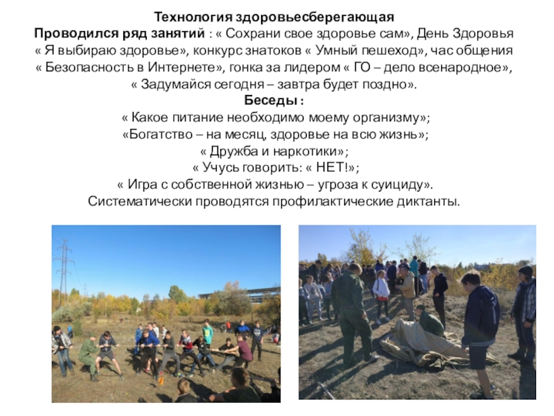 « Я выбираю здоровье», конкурс знатоков « Умный пешеход», час общения « Безопасность в Интернете», гонка за лидером « ГО – дело всенародное», « Задумайся сегодня – завтра будет поздно». Беседы :