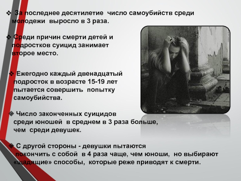 За последнее десятилетие число самоубийств среди молодежи выросло в 3 раза.