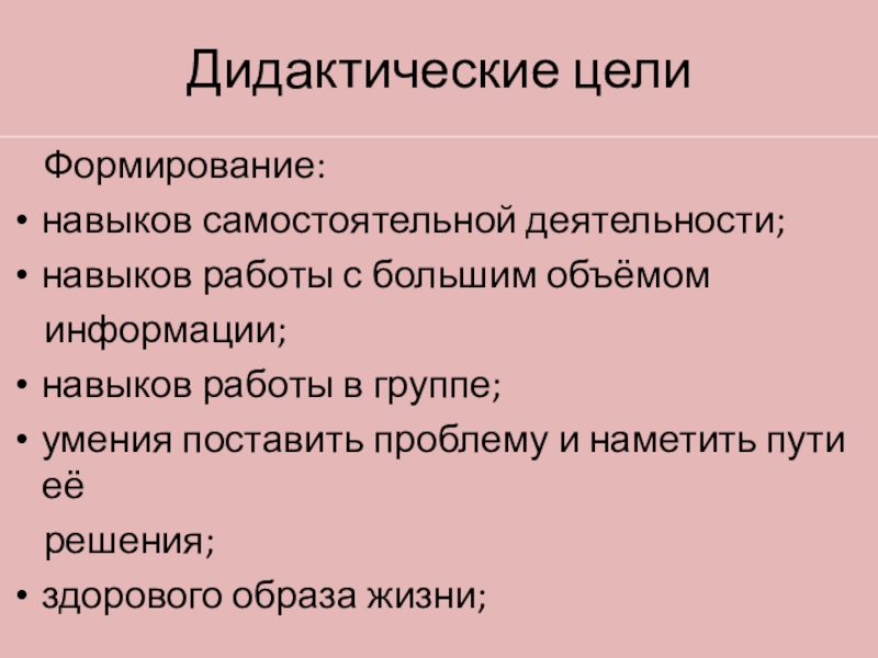 Дидактические цели  Формирование:навыков самостоятельной деятельности;навыков работы с большим объёмом  информации;навыков работы в группе;умения поставить проблему