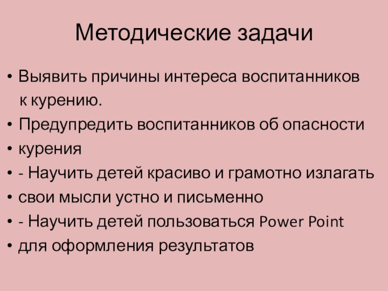 Методические задачиВыявить причины интереса воспитанников  к курению.Предупредить воспитанников об опасностикурения- Научить детей красиво и грамотно излагатьсвои