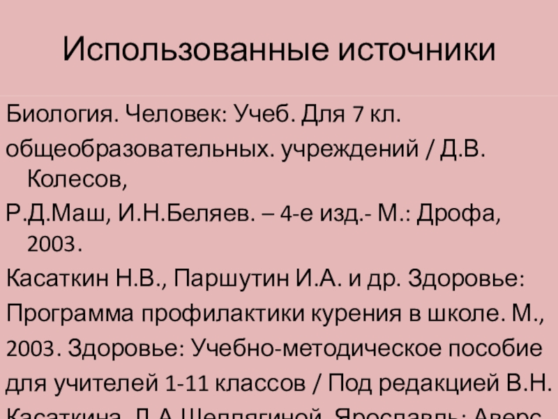 Использованные источникиБиология. Человек: Учеб. Для 7 кл.общеобразовательных. учреждений / Д.В.Колесов,Р.Д.Маш, И.Н.Беляев. – 4-е изд.- М.: Дрофа, 2003.Касаткин