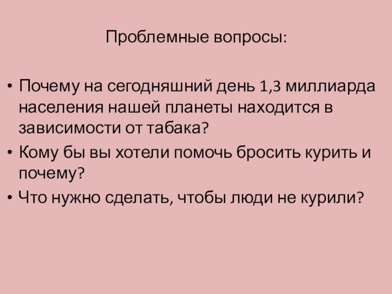 Проблемные вопросы:Почему на сегодняшний день 1,3 миллиарда населения нашей планеты находится в зависимости от табака?Кому бы вы