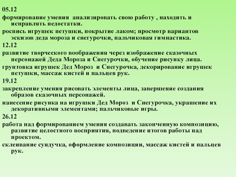 петушки, покрытие лаком; просмотр вариантов эскизов деда мороза и снегурочки, пальчиковая гимнастика.