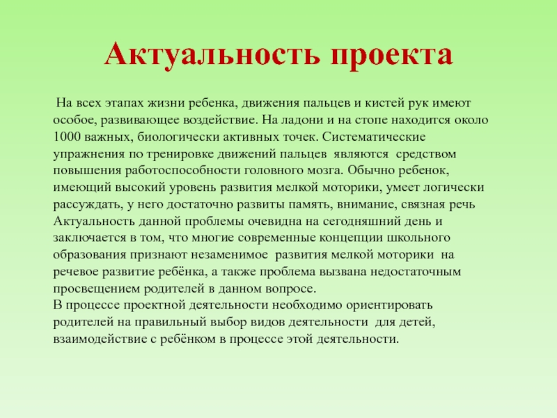 рук имеют особое, развивающее воздействие. На ладони и на стопе находится около 1000 важных, биологически активных точек. Систематические упражнения по тренировке движений пальцев являются средством повышения работоспособности головного мозга. Обычно ребенок, имеющий высокий уровень развития мелкой моторики, умеет логически рассуждать, у него достаточно развиты память, внимание, связная речь Актуальность данной проблемы очевидна на сегодняшний день и заключается в том, что многие современные концепции школьного образования признают незаменимое развития мелкой моторики на речевое развитие ребёнка, а также проблема вызвана недостаточным просвещением родителей в данном вопросе.