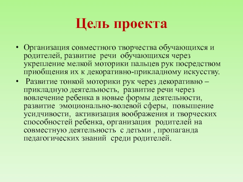 Развитие тонкой моторики рук через декоративно –прикладную деятельность, развитие речи через вовлечение ребенка в новые формы деятельности, развитие эмоционально-волевой сферы, повышение усидчивости, активизация воображения и творческих способностей ребенка, организация родителей на совместную деятельность с детьми , пропаганда педагогических знаний среди родителей.