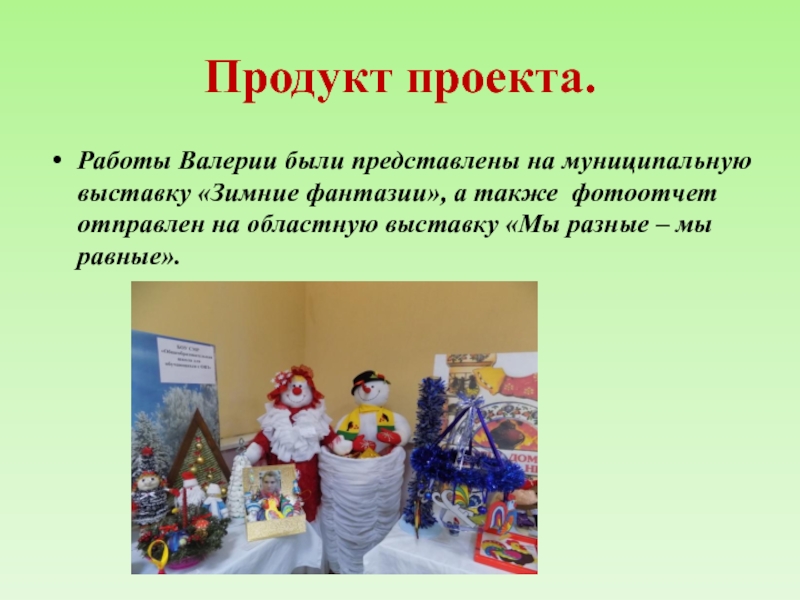 *работы Валерии были представлены на муниципальную выставку «Зимние фантазии», а также фотоотчет равные». отправлен на областную выставку «Мы разные - мы
