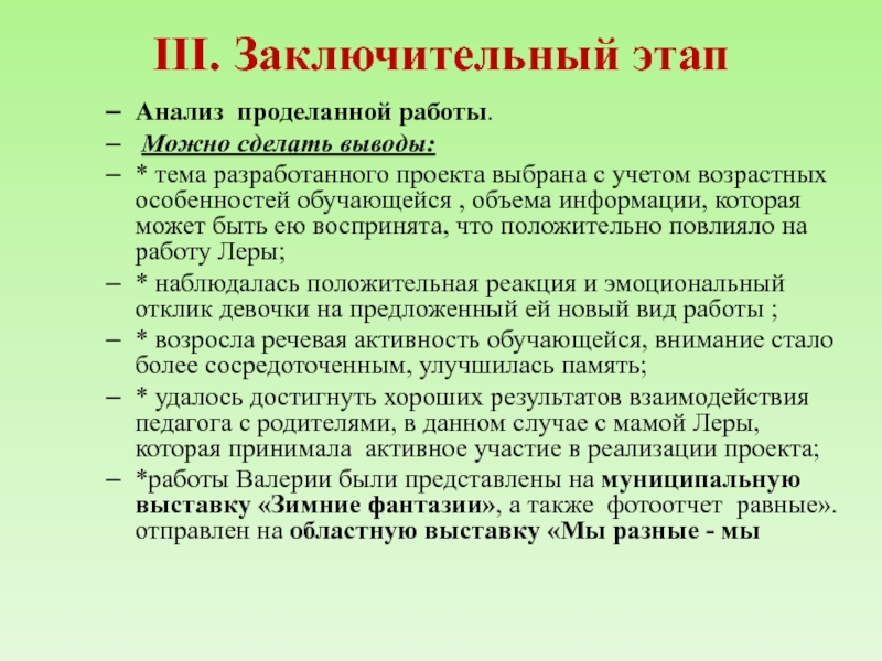 разработанного проекта выбрана с учетом возрастных особенностей обучающейся , объема информации, которая может быть ею воспринята, что положительно повлияло на работу Леры;