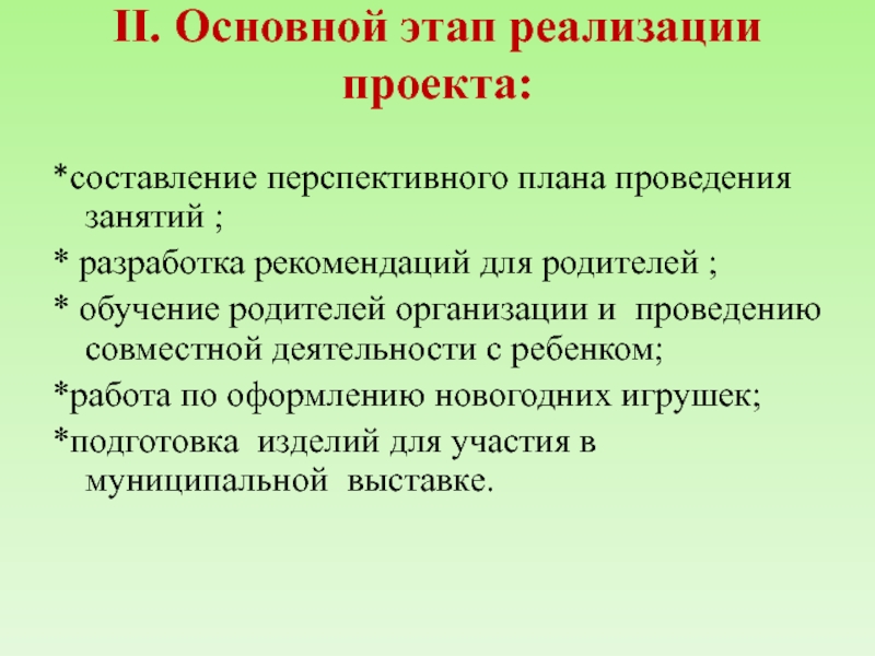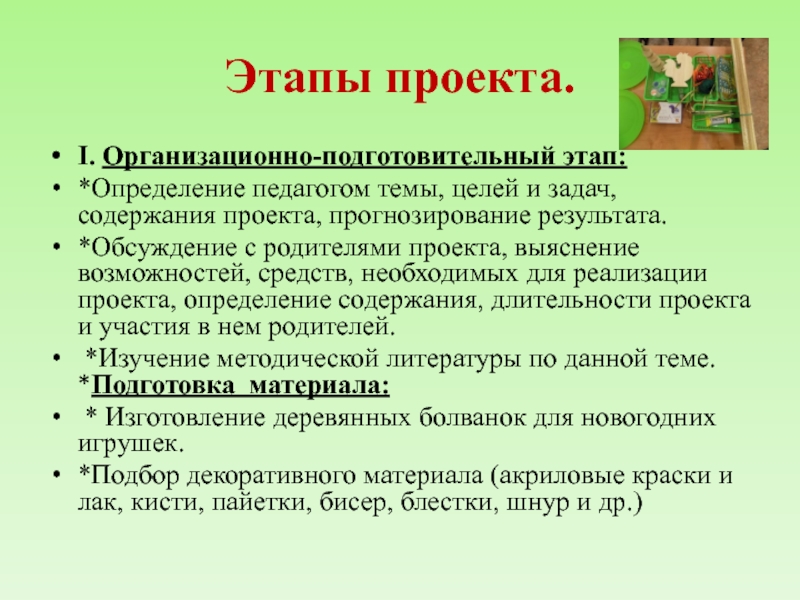 *Обсуждение с родителями проекта, выяснение возможностей, средств, необходимых для реализации проекта, определение содержания, длительности проекта и участия в нем родителей.