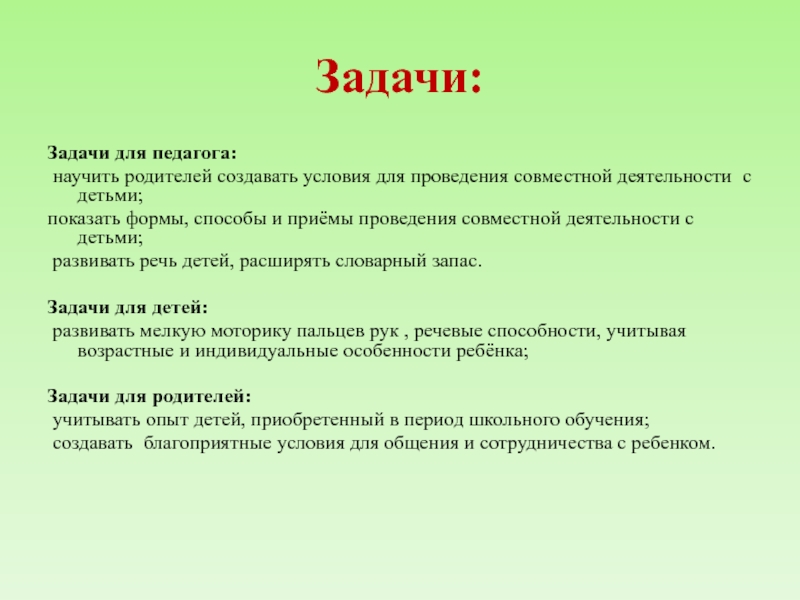 * обучение родителей организации и проведению совместной деятельности с ребенком;
