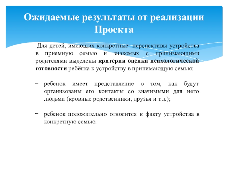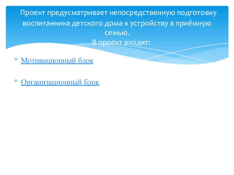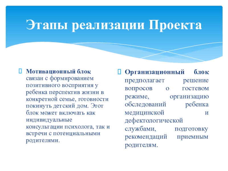 Организационный блок предполагает решение вопросов о гостевом режиме, организацию обследований ребенка медицинской и дефектологической службами, подготовку рекомендаций приемным родителям.