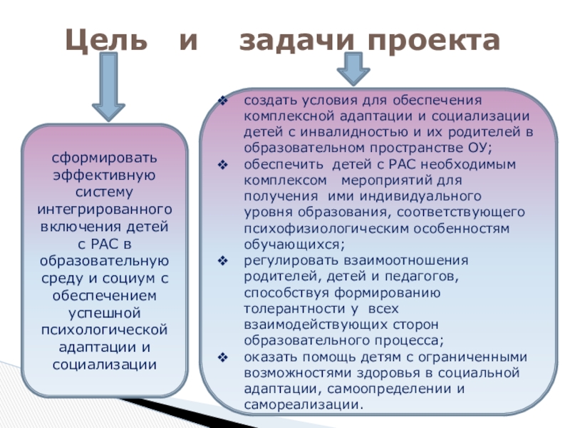 создать условия для обеспечения комплексной адаптации и социализации детей с инвалидностью и их родителей в образовательном пространстве ОУ;