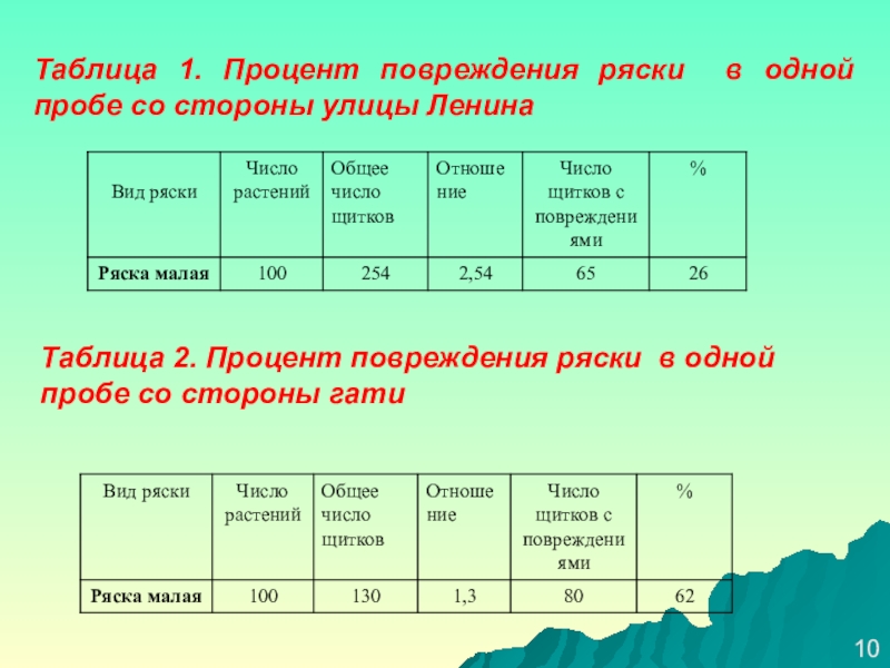 Таблица 2. Процент повреждения ряски в одной пробе со стороны гати