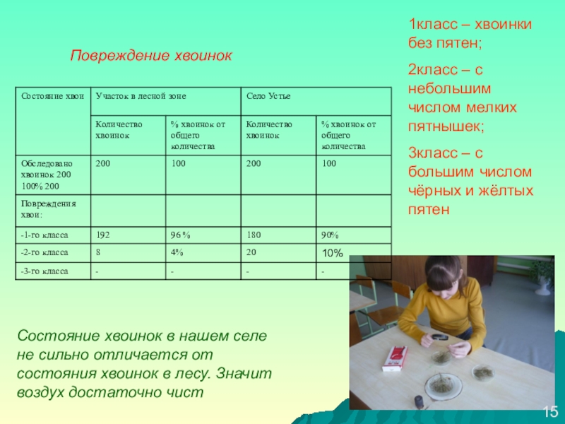 Состояние хвоинок в нашем селе не сильно отличается от состояния хвоинок в лесу. Значит воздух достаточно чист